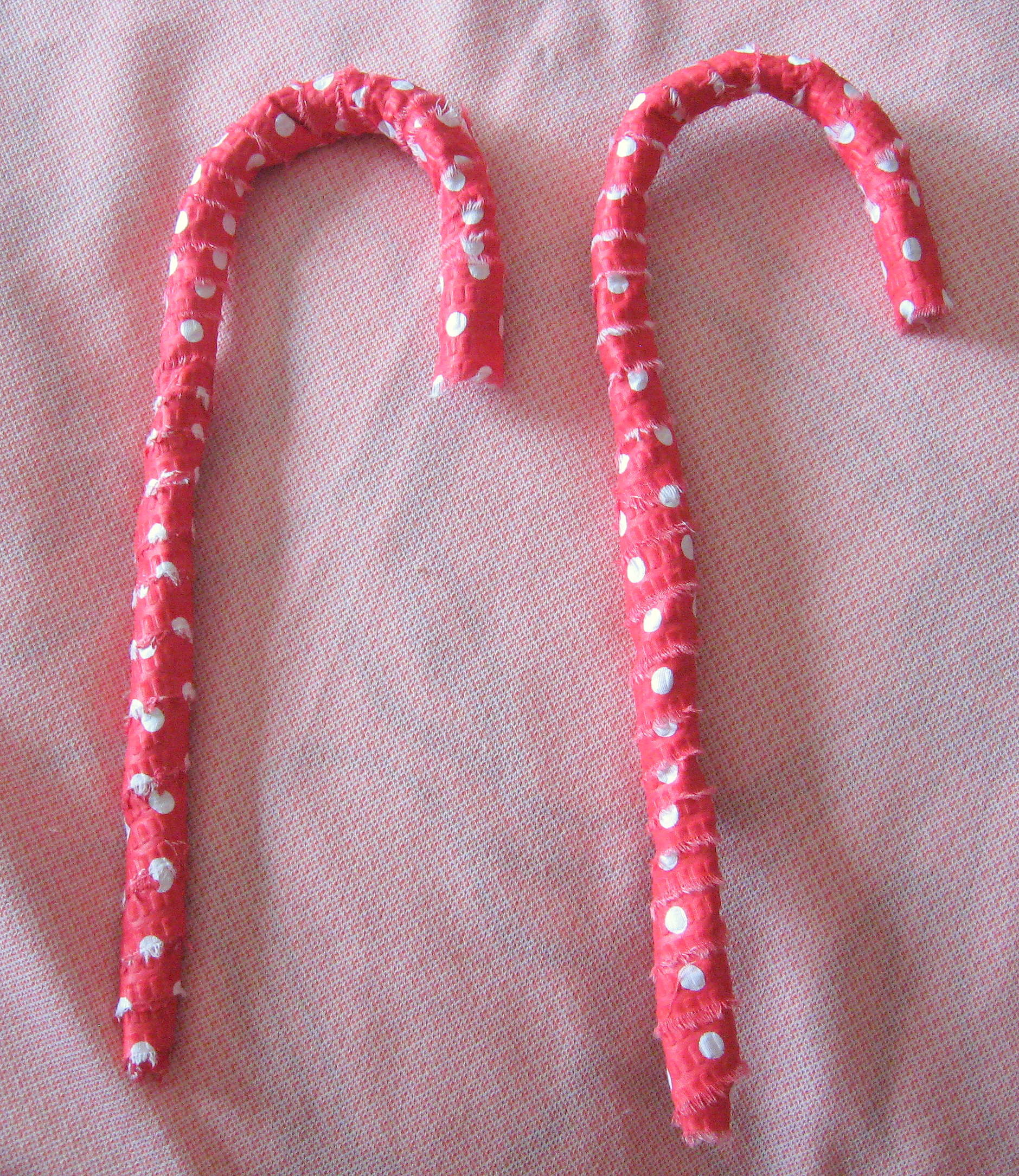 Wrap the strips around the cane, overlapping slightly as you go, and using a bead of hot glue along the top of the strip to hold it in place. Make sure that the fabric starts and ends beyond the top and bottom of the cane enough to cover the wire form.