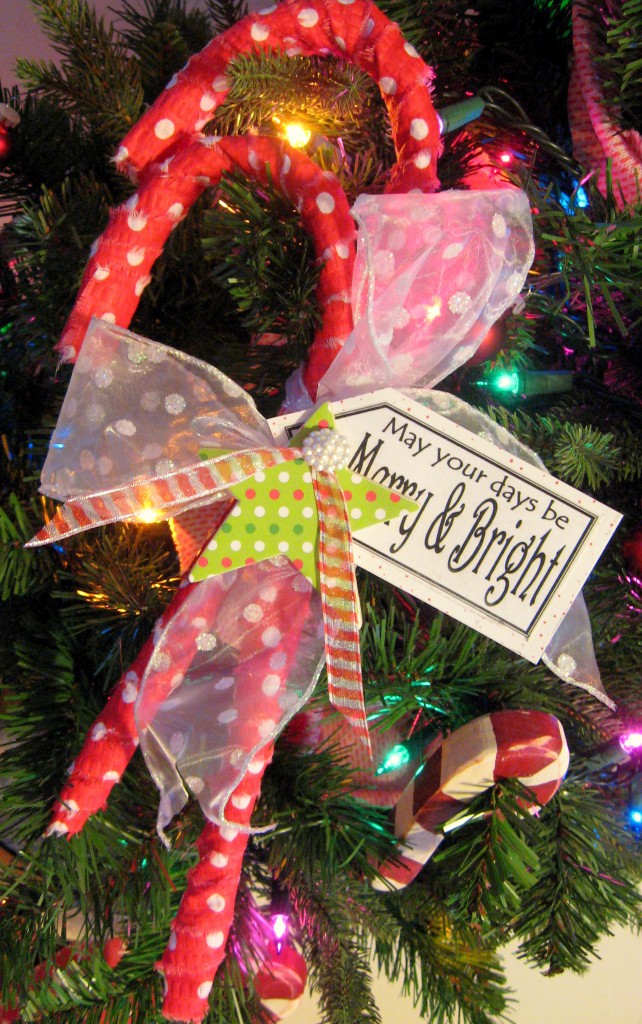 With one cane on top of the other, tie them together with a ribbon, then embellish.