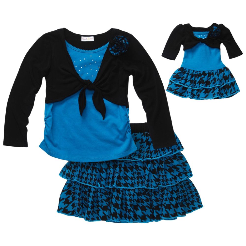 Youngland Girl’s Set 2pc Long Sleeve 2fer Tie Front Skirt Blue with Matching Doll Dress