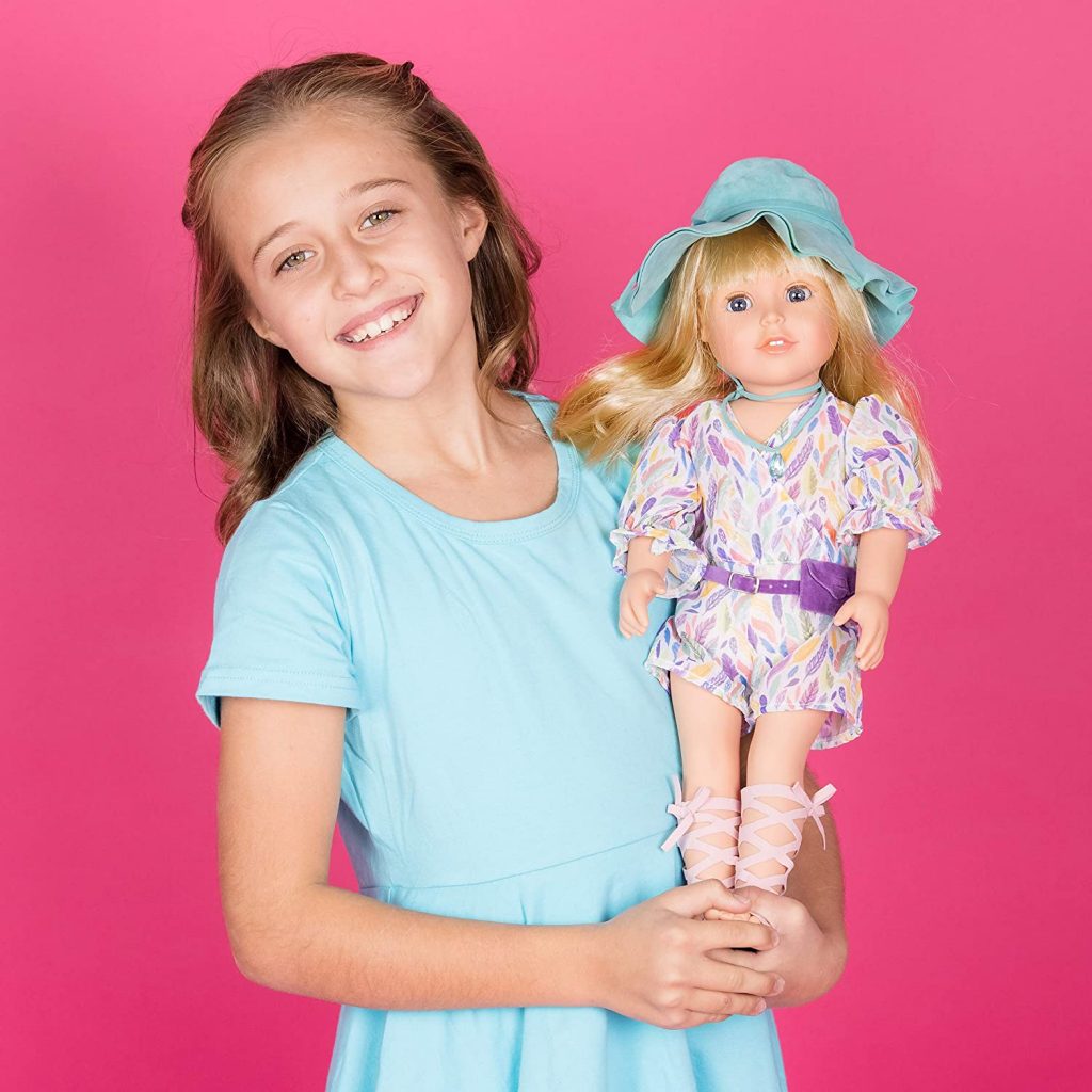 - A best friend for every child! ADORAble 18 INCH DOLL with open/close blue eyes and a blonde hair, wearing a feather-printed flounce sleeve romper, gladiator sandals, aqua stone necklace, and a purple waist belt purse. Don’t forget her blue floppy hat!