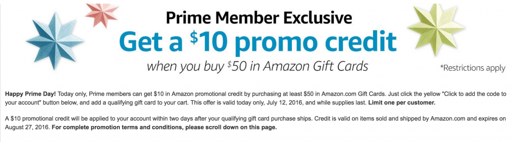 Today only, Prime members can get a $10.00 Amazon promotional credit when they purchase at least $50 in Amazon Gift Cards. Follow these steps to get this deals: