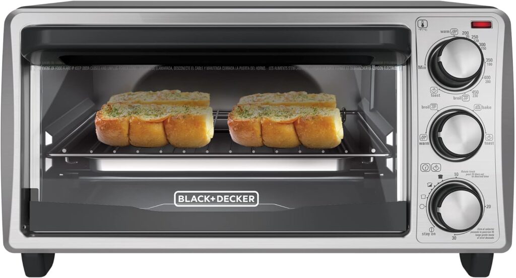 • Four Functions – The stainless steel/black toaster oven’s cooking functions include: baking, broiling, toasting, and keeping food warm.