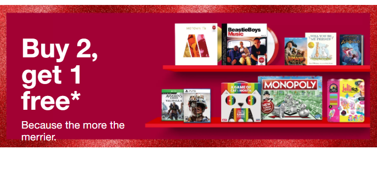 Check a few goodies off those gift lists this week with a little help from Target! Grab some great deals on movies, games, books, and music during this Buy 2, Get 1 free sale though 11/14! A lot of the eligible items in this sale are also marked down, which makes for some even better deals!
