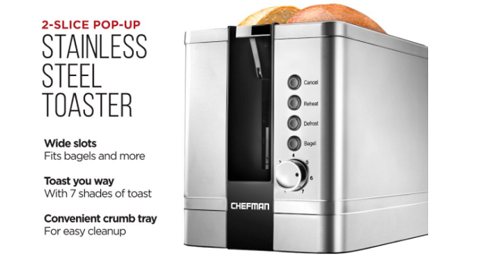 Walmart has the Chefman 2-Slice Pop-Up Stainless Steel Toaster w/ 7 Shade Settings for only $15.90! (Reg. $30) Get perfectly toasted homemade bread, bagel halves and hamburger buns, or crisp up English muffins or frozen waffles. With a user-friendly control panel that offers 7 precise browning settings to choose from, it’s easy to make toast exactly the way you like it! Not sure which shade setting to use? Select from a variety of the preset functions such as toast, bagel, or defrost.