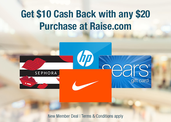 Plus, Raise is offering $10 off any purchase of $50+ in addition to the $10 cash back you will receive from TopCashback!  That’s a total of $20 off of $50+!