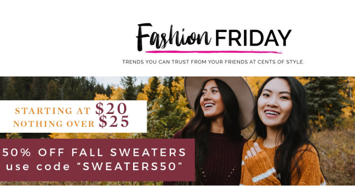 Check out this great deal that is perfect for fashion fanatics – get Fall Sweaters for 50% Off! There are so many styles and colors to choose from! Just in time to get an upgrade for fall wardrobe fun! Plus get free shipping at Fashion Friday from Cents of Style! Just use coupon code SWEATERS50!