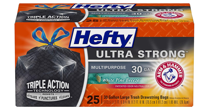 Get on over to Amazon and get Hefty Ultra Strong Multipurpose Large Trash Bags, 30 Gallon, 25 Count – Just $4.32!