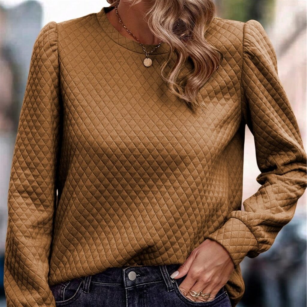 Elevate your wardrobe with this solid-colored sweatshirt for a stylish and flexible look. Enjoy added warmth with the quilted design giving an additional layer of texture and insulation. Show off a chic and feminine style with the puff sleeves. Get timeless sophistication and a perfect fit from the classic crew-neck silhouette.