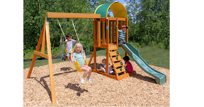Walmart has the KidKraft Ainsley Wooden Swing Set / Playset for only $264 Shipped! (Reg. $400) The multi-level Ainsley Play / Swing Set from KidKraft can do something for smaller back yards that swing sets alone can’t—entertain up to six active kids at once. That’s because Ainsley packs in loads of fun features like a high-rail wave slide, a multi-colored rock wall for climbing and a shaded upper-level clubhouse with chalkboard tarp.