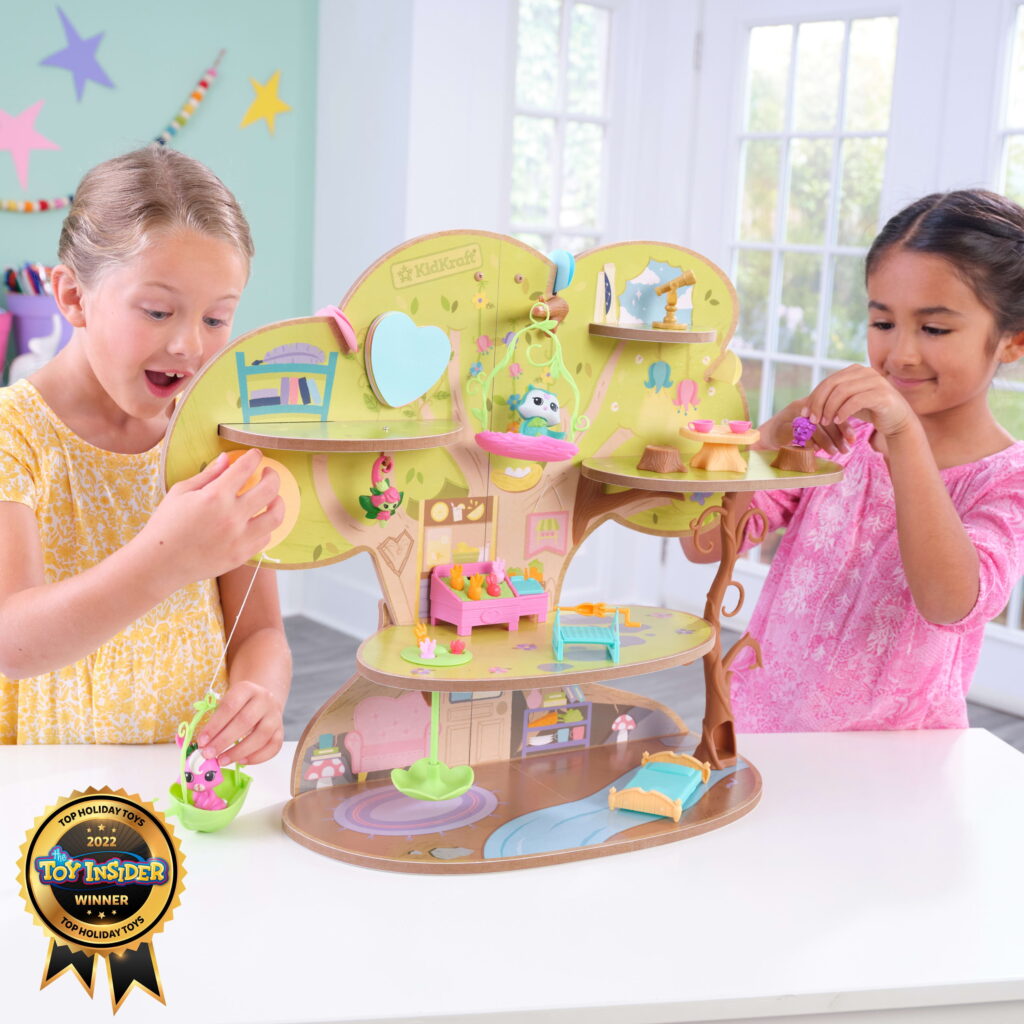 Celebrating earth’s beauty, the KidKraft Lil Green World Wooden Market Treehouse Play Set offers branches full of fun and surprises for your little ones. This wooden treehouse play set features a leaf elevator, a healthy garden market on the main level, doll food items like fresh veggies, a produce stand, a cash register, a carrot rotisserie, a stump table and stools, a nest perch, and more. Characters like Posey the Flower Fairy, Ollie the Owl, Belle the Bunny, and Oakley the Acorn Sprite touch and delight the imagination of your little ones. With the KidKraft Lil Green World Wooden Market Treehouse Play Set, dreams do come true.