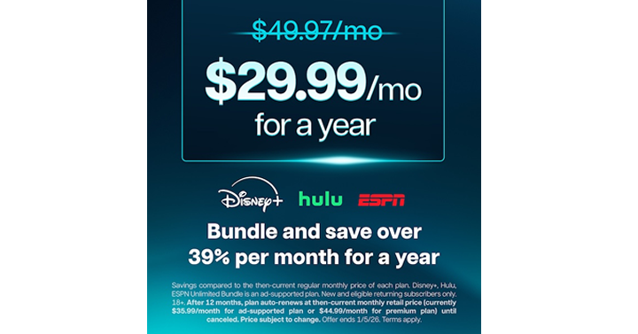 NEW: Save over 39% a month for a year with the Disney+, Hulu, ESPN Unlimited Bundle* Bundle all three for just $29.99/mo. for a year and stream thousands of movies and shows, plus all of ESPN’s networks and services, including ESPN+.