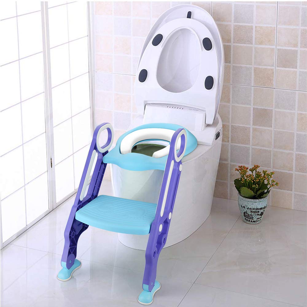 This seat fits most toilets and is made from thick, non-toxic waterproof and mildew-proof PP material. It has a double handrail, soft seat, and rotatable foot rests. The footrest is adjustable (2 choices of height) to meet different demands of different ages of children, even they grow up. It can also be folded up and put out of the way when not in use.