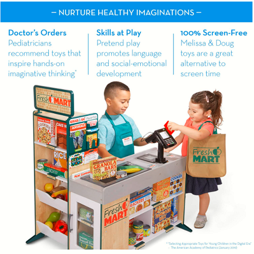How cute is this? Right now on Amazon, you can get this Melissa & Doug Grocery Store for Only $162.99 Shipped! (Reg. $230). Shopping and playful purchasing will never be more fun than with the sturdy, wooden Fresh Mart Grocery Store! The free-standing play space with smooth, curved corners and edges lets customers three and older browse the shelves and pay for purchases on one side and allows the grocer to ring up items on the other. Realistic features include beeping “scanner,” hand-crank conveyor belt, bagging area, card-swiping machine, keypad/calculator, and cash drawer. There is ample shelving on both sides for display and storage. Kids are sure to find everything on their shopping list at this friendly neighborhood grocery store. Kids are sure to find everything on their shopping list at this friendly neighborhood grocery store. The Freestanding Wooden Fresh Mart Grocery Store makes a great gift for kids ages 3 and up. For added enjoyment, consider adding the Fresh Mart Companion Collection. The Fresh Mart Grocery Store measures 42″H x 35″L x 27.5″W when assembled. For more than 30 years, Melissa & Doug has created beautifully designed imagination- and creativity-sparking products that NBC News called “the gold standard in early childhood play.” Today, Melissa & Doug is proudly partnering with the American Academy of Pediatrics to foster early brain development and help children build important life skills through play.