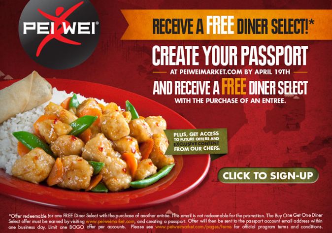 If you didn’t sign up for a Pei Wei Passport account last go round, it is available again. Click here to sign up and get a coupon valid for a Free Diner Select with purchase of any entree.