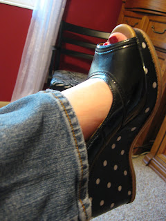 NOTE: I didn’t take pictures as I went along, because to be honest I didn’t think it would work. I’ve gone back now and taken some pictures to show you how I did it. Don’t let it confuse you that the “during” pix are being taken on the “finished” shoe.
