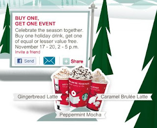 Stop by your local Starbucks on 11/17-11/20/11 between 2-5pm and holiday drinks (Gingerbread Latte, Peppermint Mocha or Caramel Brulee Latte) are Buy 1, get 1 FREE.
