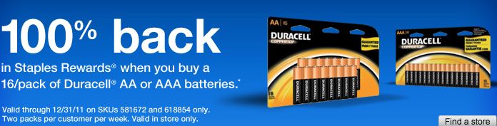 100% back in Staples Rewards when you buy a 16/pack of Duracell AA or AAA Batteries thru 12/31/11. 2 packs per customer per week. In-store only.
