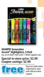 Click here, enter your zip code and email address to print your coupon valid for Free Sharpie Generation Accent Highlighters 5-Pack at Office Max. Limit 1. Expires 6/18/11.