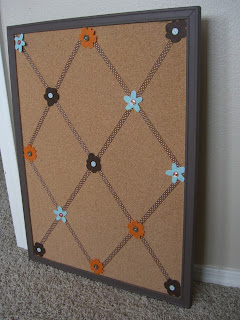 I painted the edges with acrylic craft paint. (I didn’t want to take the time to sand before I painted, so I didn’t rough it up afterwards.) You can also put on a shiny finish if you want. I have these super cute felt flowers by American Crafts that I have been wanting to use for something, so I just took some ribbon, a stapler, the flowers and buttons and got to work. I think the end result is adorable! I love it! I plan on hanging it on the wall to the side of my desk.