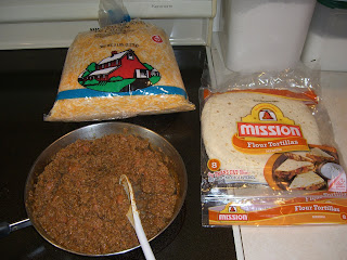 Brown hamburger. Add beans, taco sauce, and chilies. Roll 4-5 TBL in each flour tortilla. Sprinkle with cheese. Wrap up tight. Wrap in plastic wrap and freeze. When ready to eat, place in microwave. Top with sour cream, salsa, etc.