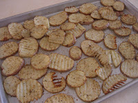 Layer the potatoes on a shallow pan or cookie sheet in a single layer. Put in oven and bake for about 25 minutes or until lightly brown and tender. Longer if you want them crispy. Turn the potatoes halfway through the baking process.