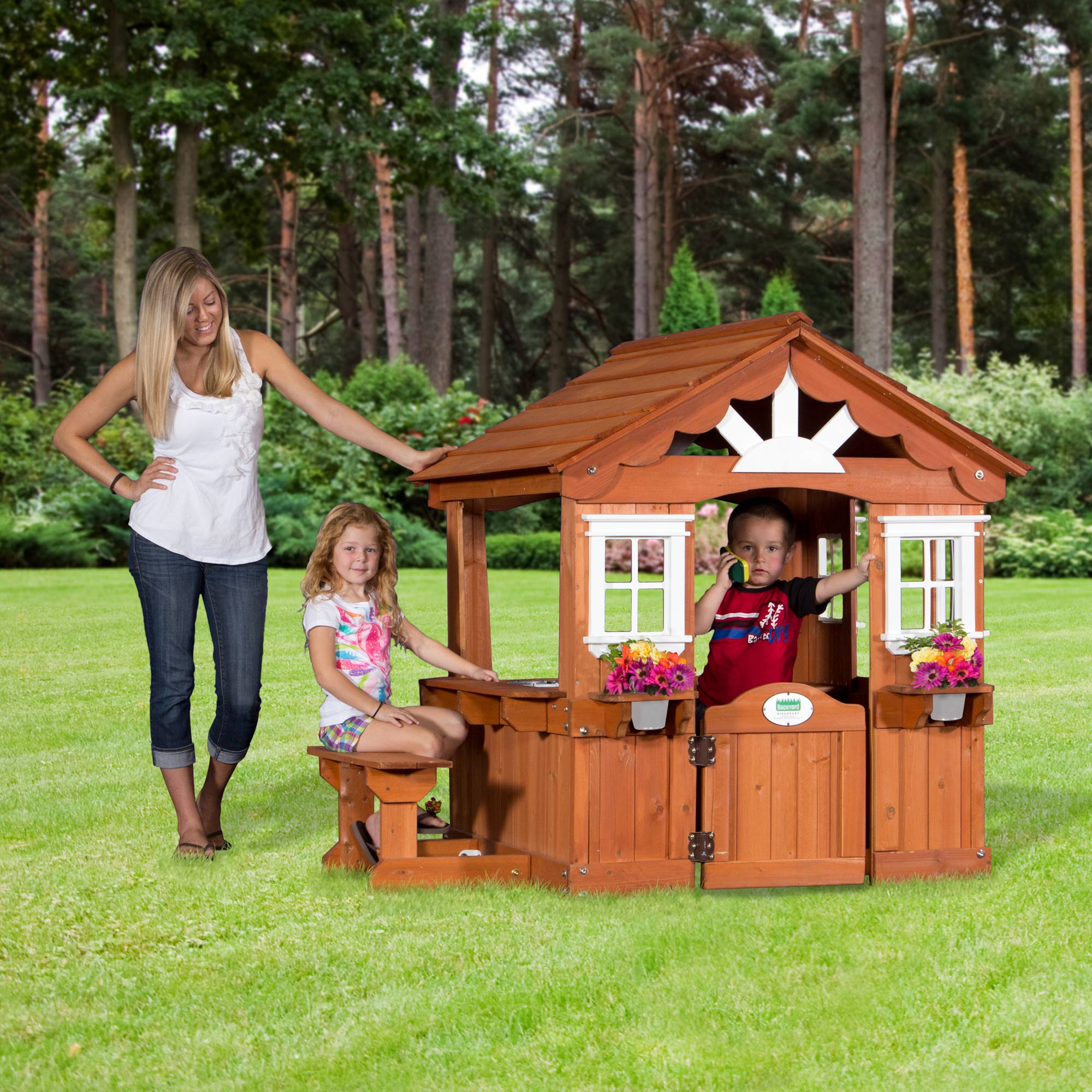 The Scenic Playhouse is a great playhouse for having hours of imaginative play. It has a cute design with scalloped roofline, sunburst end gables, and wide-open side windows for taking the vistas of the backyard.
