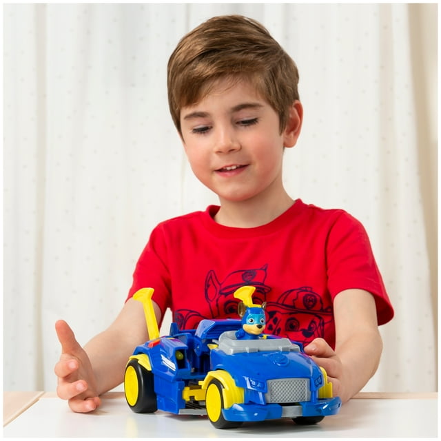 - TRANSFORMING POLICE CAR TOY: Chase’s cruiser transforms to sleek superhero vehicle! Push the spoiler down to enter Powered Up mode, revealing translucent lightning details and projectile launchers! Pull up on the spoiler to switch back into deluxe vehicle.