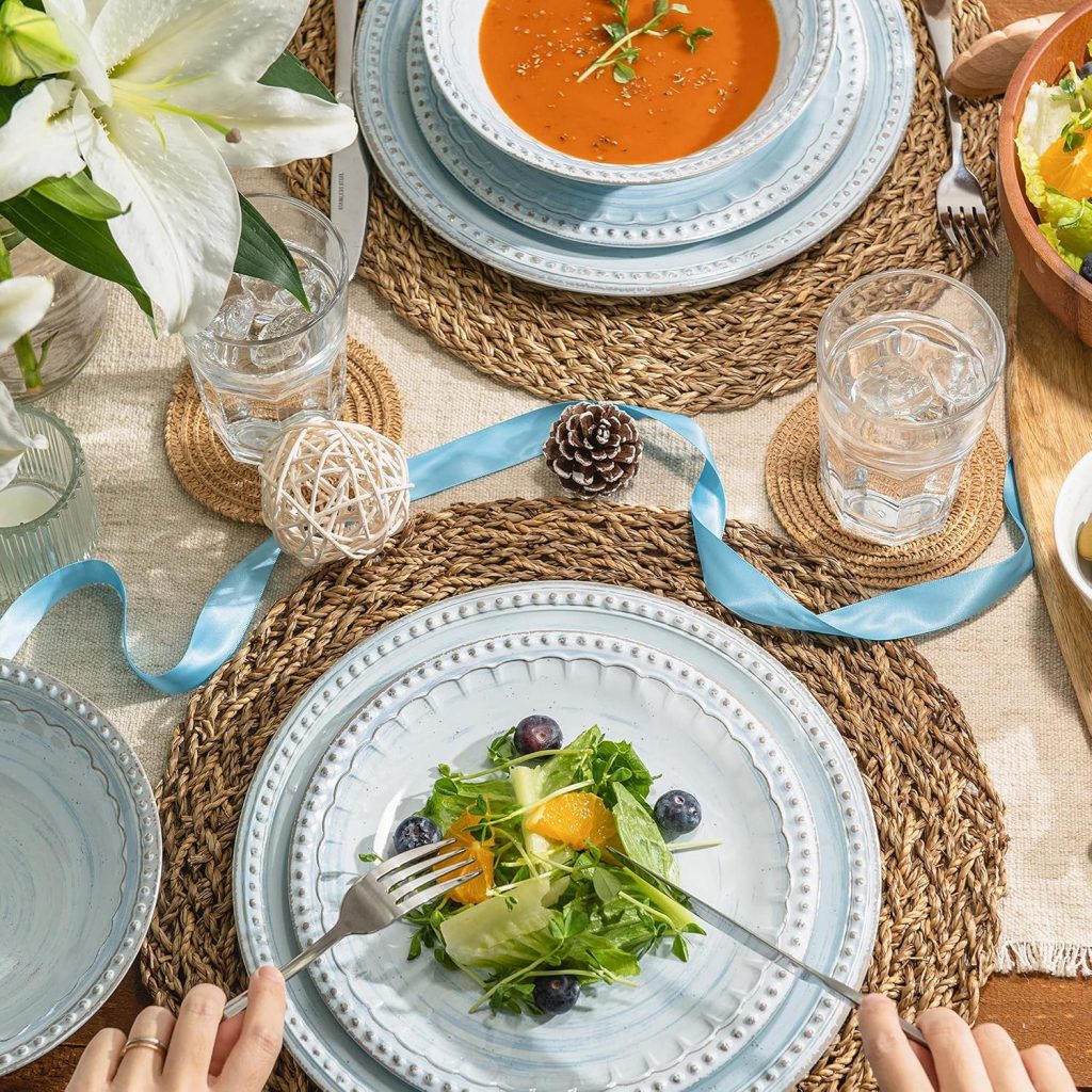 - AESTHETIC AND FUNCTIONAL:The modern embossed design tastefully layers together and makes a nice addition to existing dinnerware pieces, table linen, and surrounding decor. This dinnerware set is perfect for both everyday use and special occasions.
